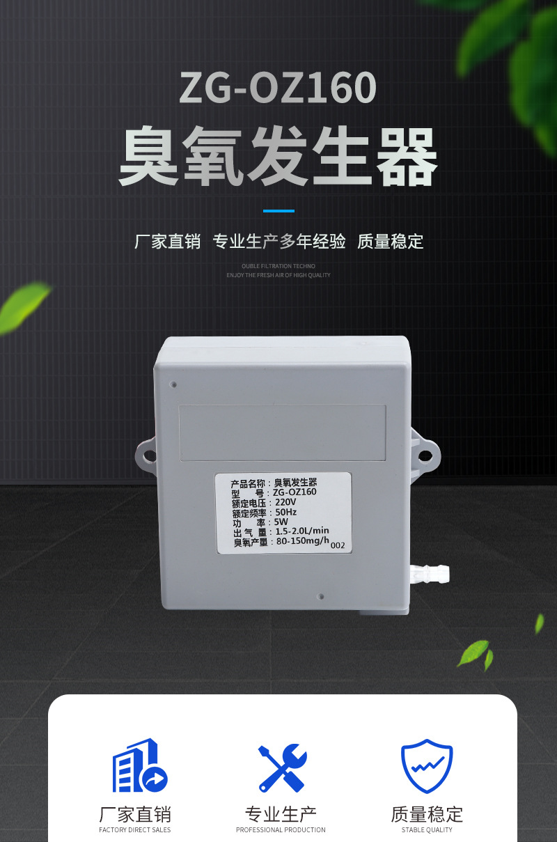 ZG-OZ160小型臭氧發(fā)生器采用最新的臭氧核心放電體,包括臭氧發(fā)生管、臭氧驅(qū)動(dòng)電路和氣泵的一體化設(shè)計(jì),只要接上電源即可提供高效穩(wěn)定的臭氧輸出,安裝使用維護(hù)方便。